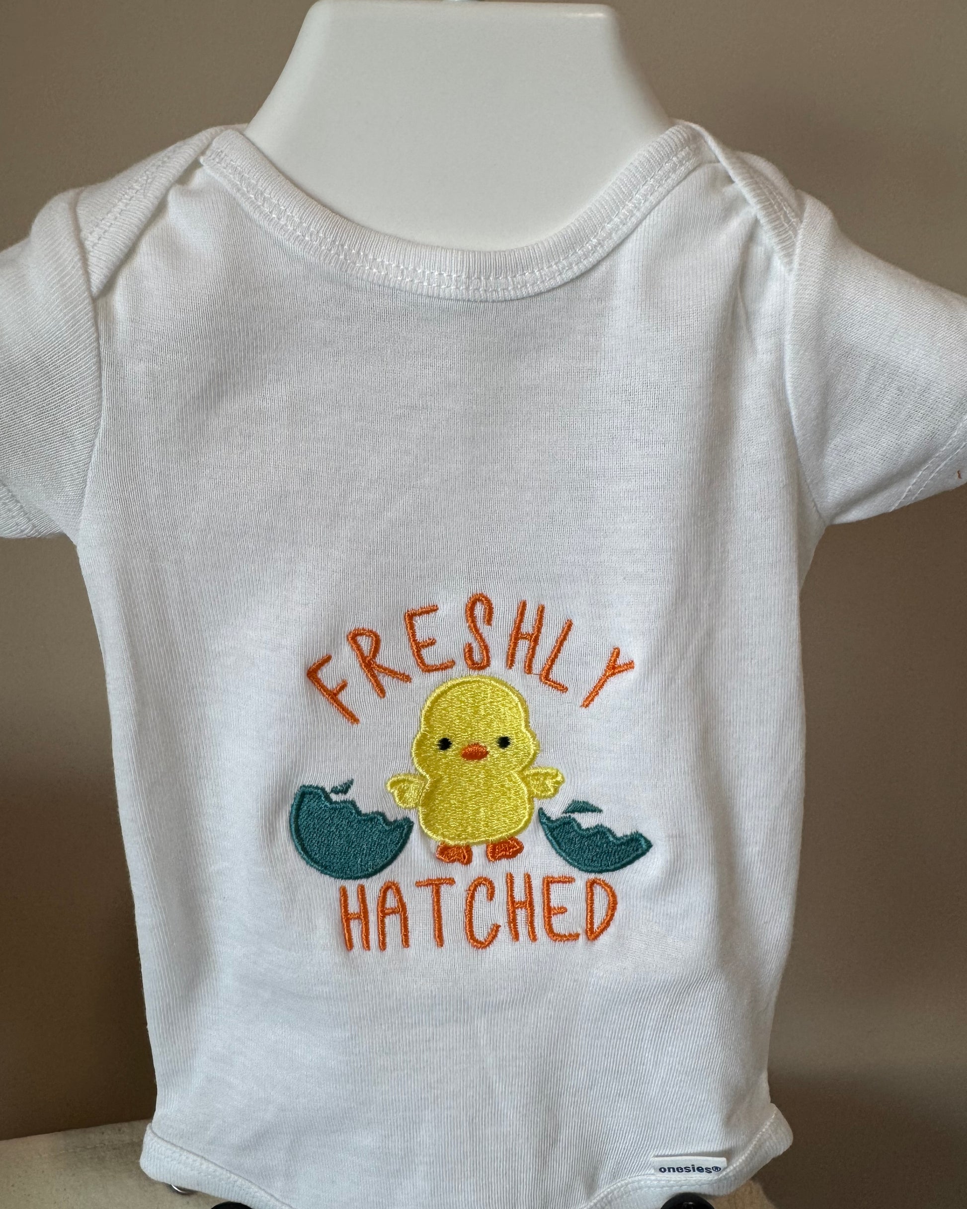 Introducing our freshly hatched onesie and bib set, perfect for your newborn! This set provides comfort and functionality for your little one's everyday needs. Keep your baby looking adorable while also keeping them clean with our freshly hatched embroidered bib.
