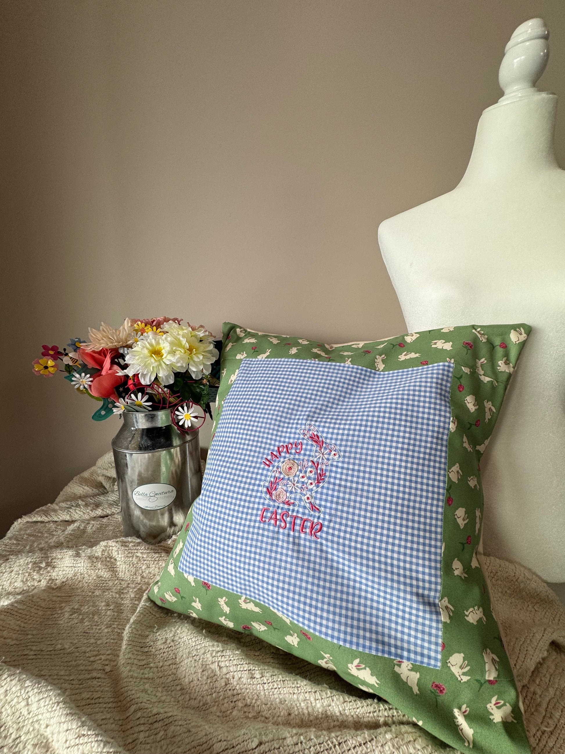 Enhance your Easter decor with the charming Cotton-Tail Farms Blue Gingham Easter Pillow. Expertly crafted and embroidered with precision, this pillow brings a touch of spring to any room. Its custom design adds a unique flair to your holiday celebrations. A must-have for any Easter enthusiast.