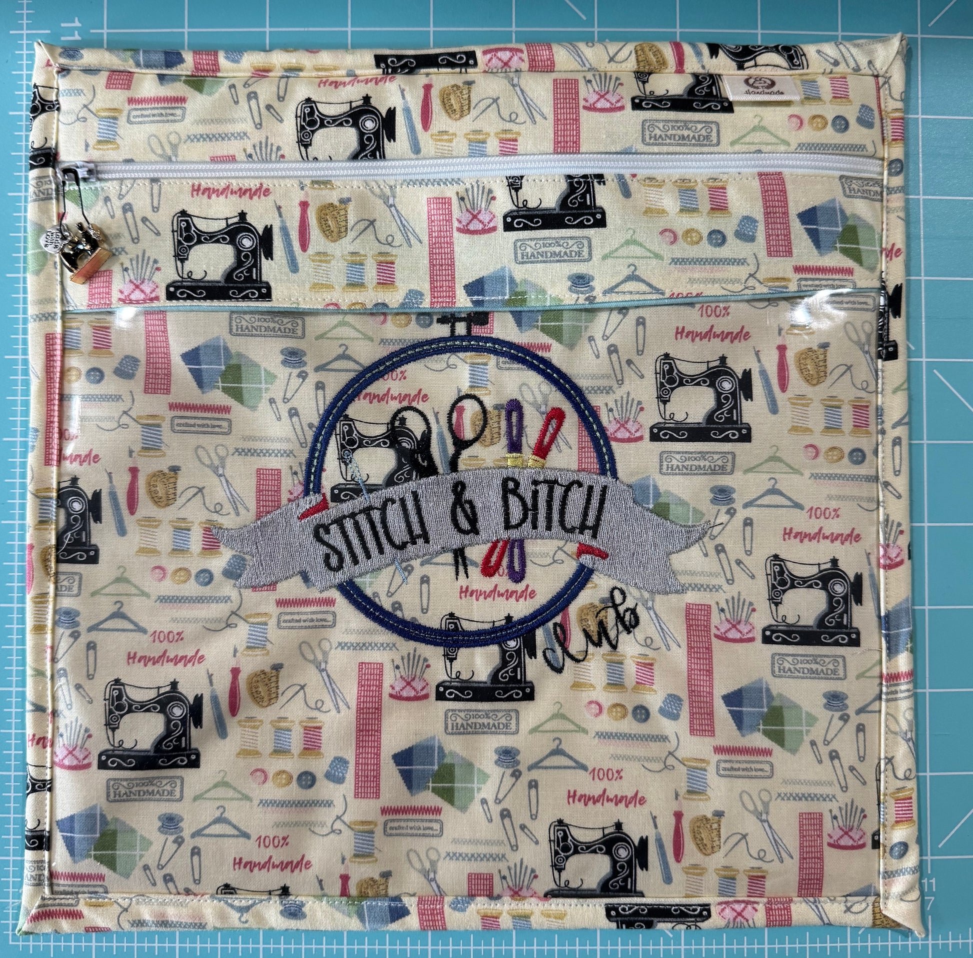 This handcrafted vinyl front project bag is a must-have for every stitcher. Featuring an impeccable machine-embroidered sewing hoop, scissors, thread, and a playful nod to the Stitch and Bitch Club, it's both stylish and practical. Keep your projects organized and on the go with this unique, high-quality bag.