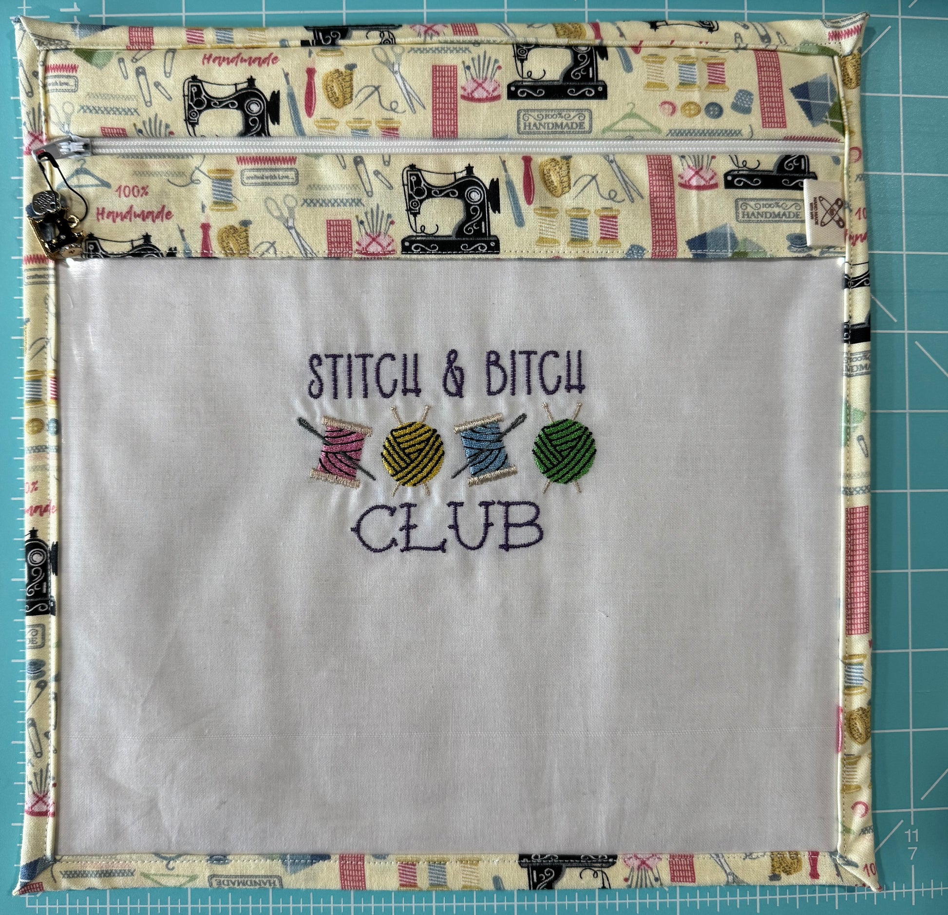 This handcrafted project bag is a must-have for every stitcher. Featuring impeccable machine-embroidered spools of thread and a playful nod to the Stitch and Bitch Club, it's both stylish and practical. Keep your projects organized and on the go with this unique and high-quality bag.