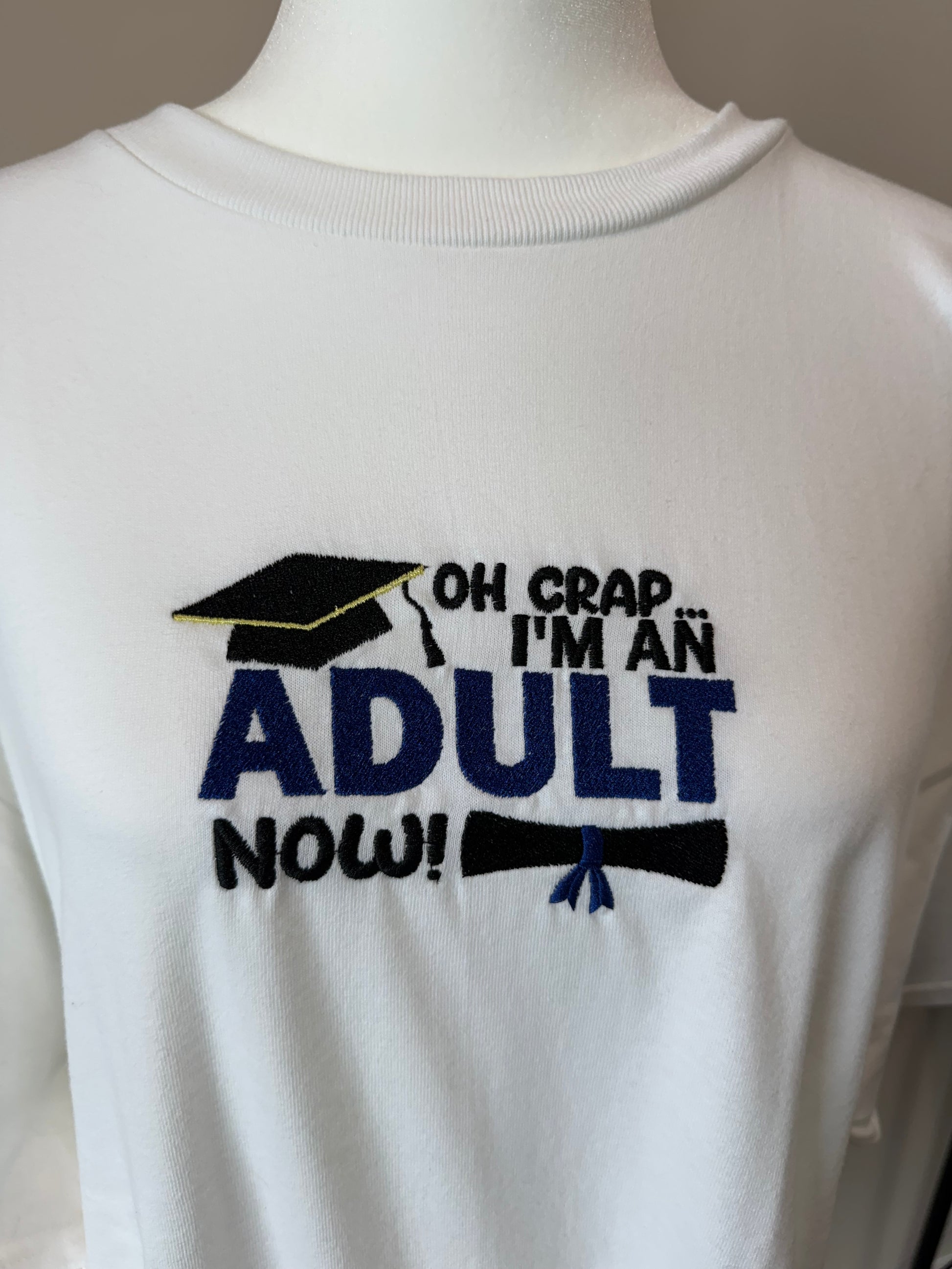 Celebrate your graduate's achievement with our "Oh Crap, I'm an Adult Now" graduation t-shirt. This hilarious shirt serves as a reminder of the responsibilities that come with adulthood while adding a touch of humor to their special day. A perfect gift for any new adult ready to take on the world!