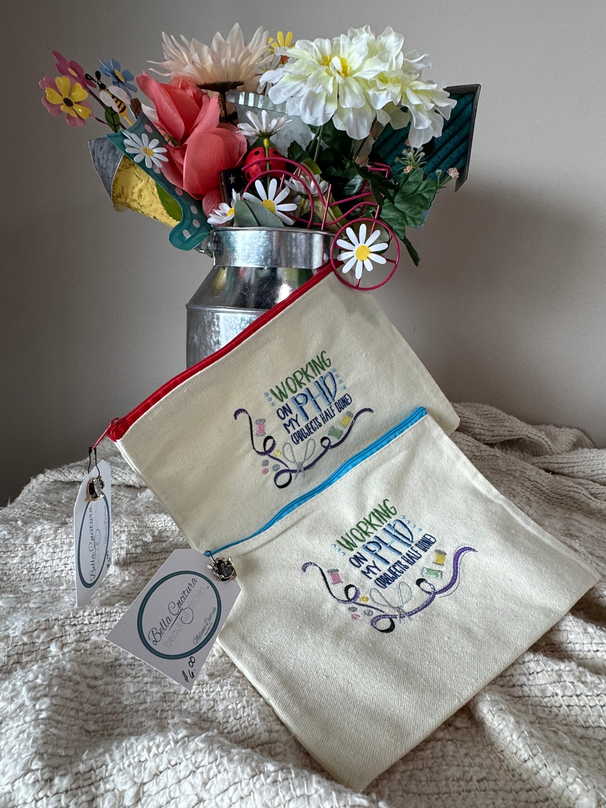 This craft bag or pencil case features the saying "Working on my PHD (Projects Half Done)." With this convenient case, you can keep your projects organized and easily accessible with this convenient case.